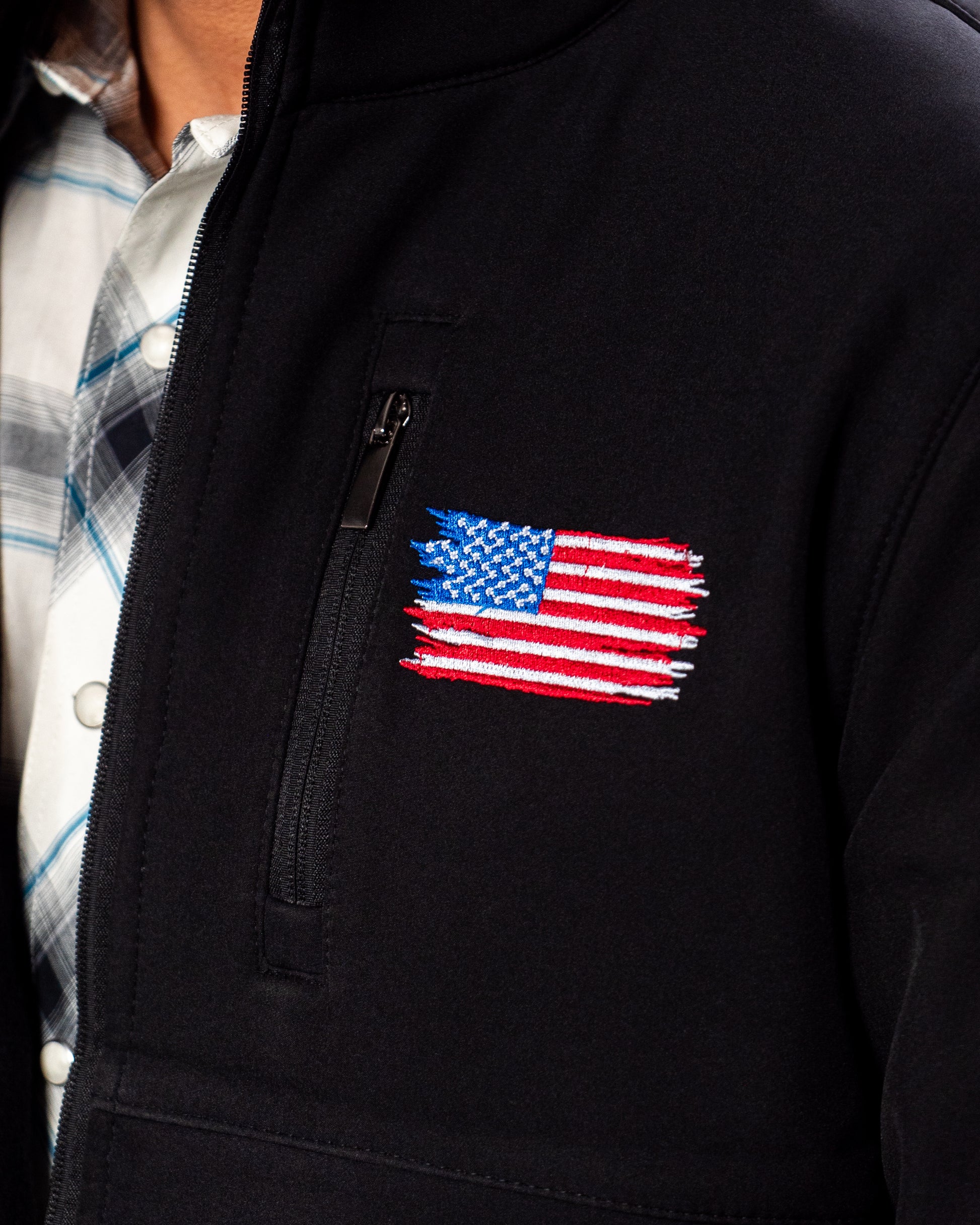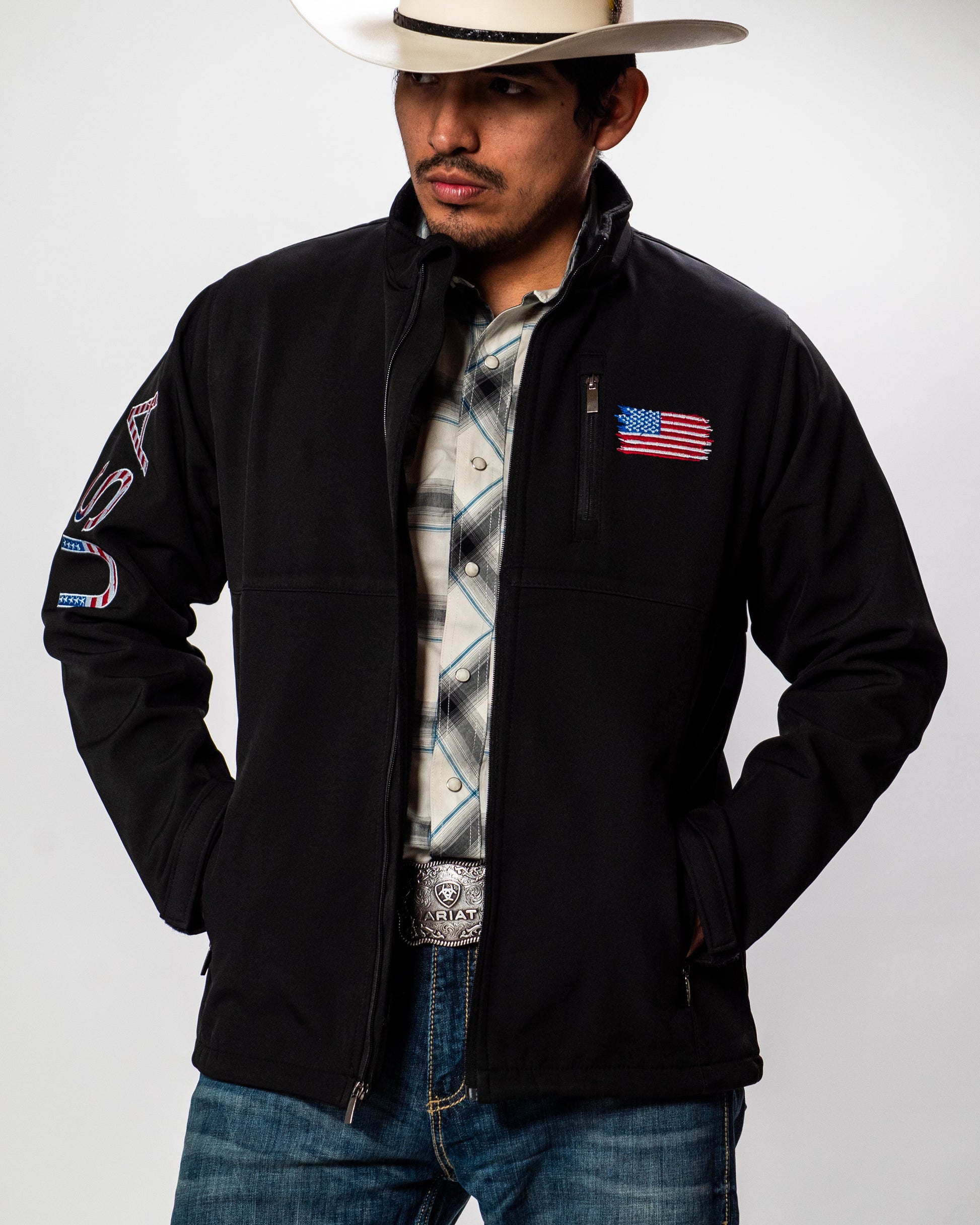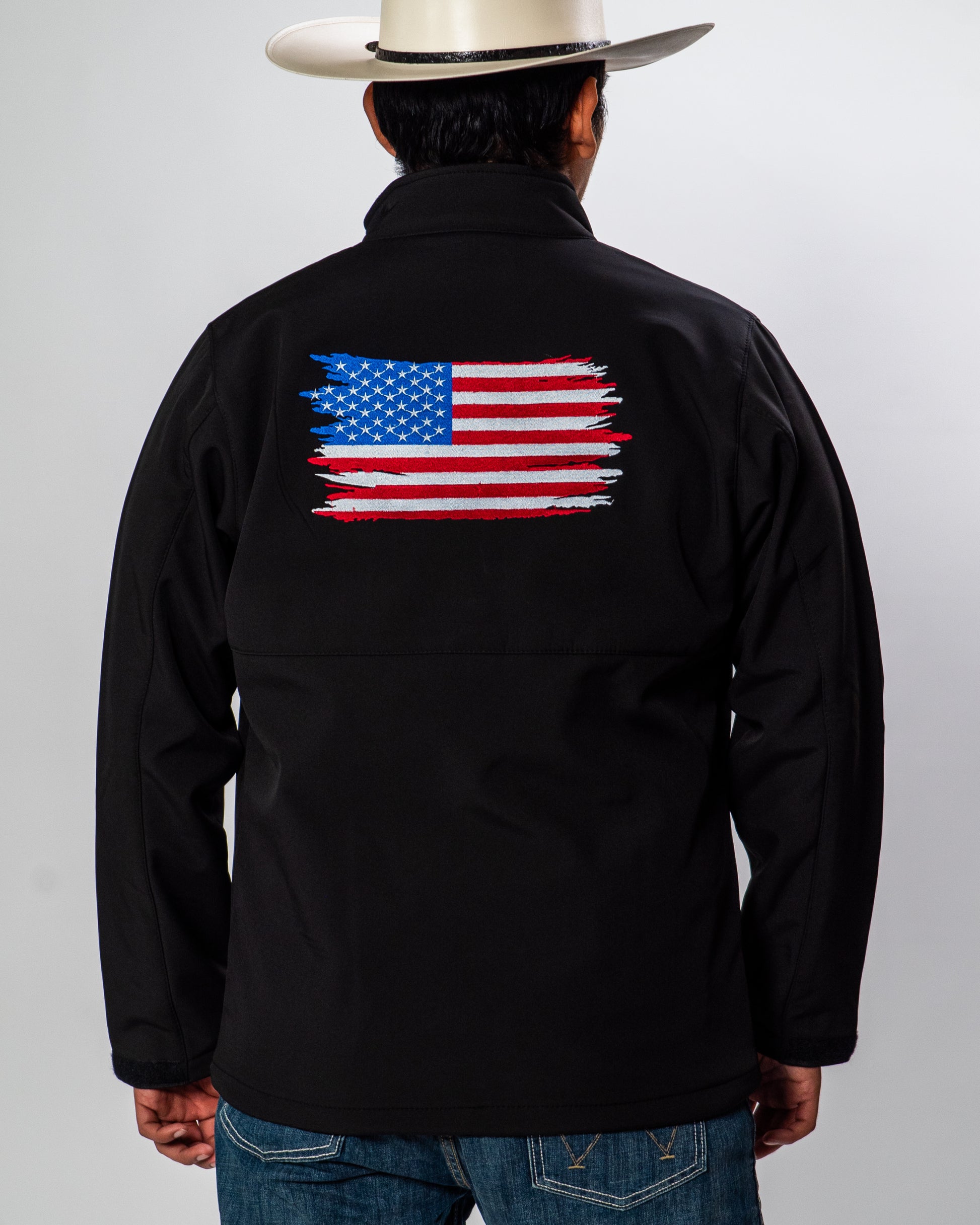 Men's Softshell Jacket with bold US Flag Team design. Lightweight, wind-resistant, and flexible, perfect for everyday wear and outdoor activities. Combines comfort, style, and rugged Western-inspired durability.