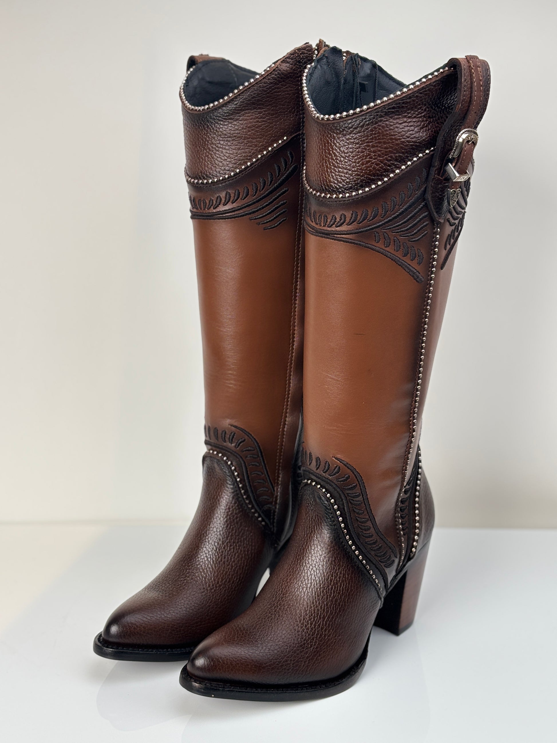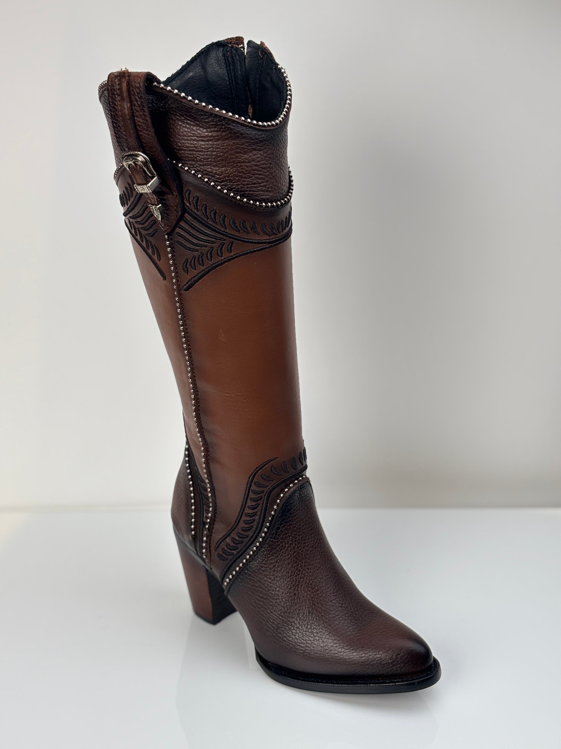 Elevate your western wardrobe with the Cuadra Women's Chocolate Embroidered Round Toe Knee-High Boot—a masterpiece of artisan craftsmanship. Hand-painted premium bovine leather showcases intricate organic embroidery, complemented by decorative metal chain and polished buckle details. The internal zipper delivers a secure, adjustable fit, while the durable leather sole with TPU reinforcement provides reliable traction and longevity. These knee-high boots merge heritage design with contemporary sophistication, delivering both refined elegance and bold character for the discerning western enthusiast.