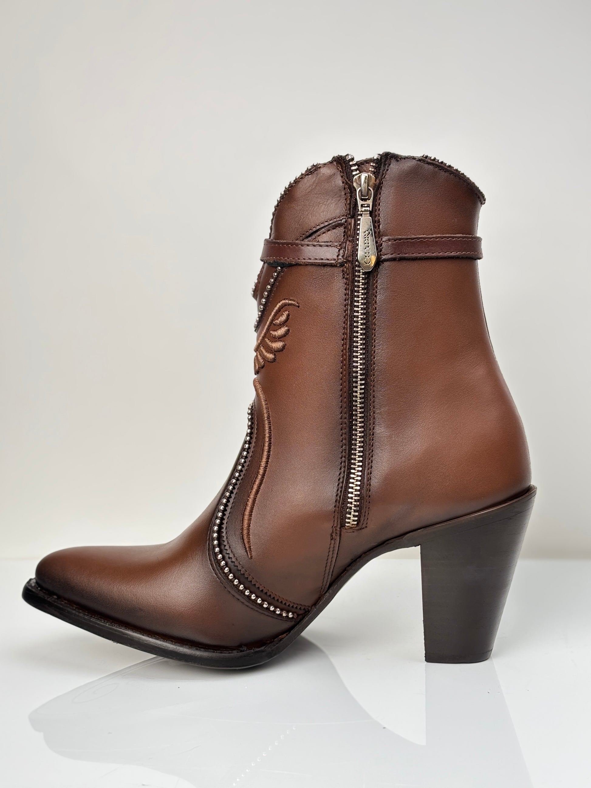 Step into refined Western style with Cuadra's Women's Embroidered Honey Western Ankle Booties. Crafted from premium hand-painted bovine leather in a warm honey tone, each pair features authentic embroidered Western motifs that showcase meticulous artisanal detail. Decorative metallic studs and a refined buckle accent the design, blending contemporary sophistication with heritage aesthetics. The internal zipper and adjustable leather strap provide a secure, customized fit, while the durable TPU-injected sole ensures confident traction whether navigating urban streets or evening venues. Engineered for all-day comfort without compromise, these ankle booties deliver versatile elegance for the discerning Western wear enthusiast.