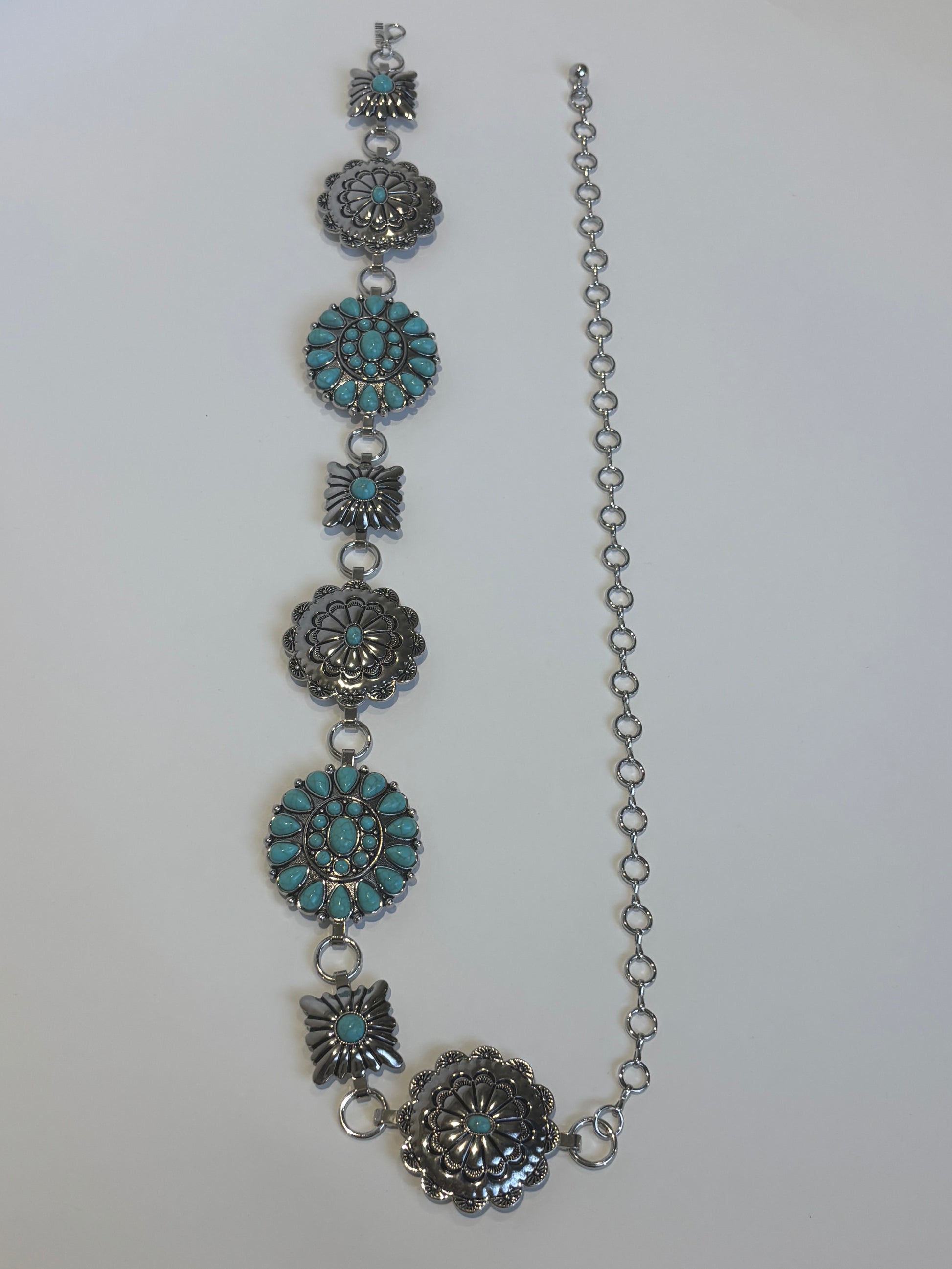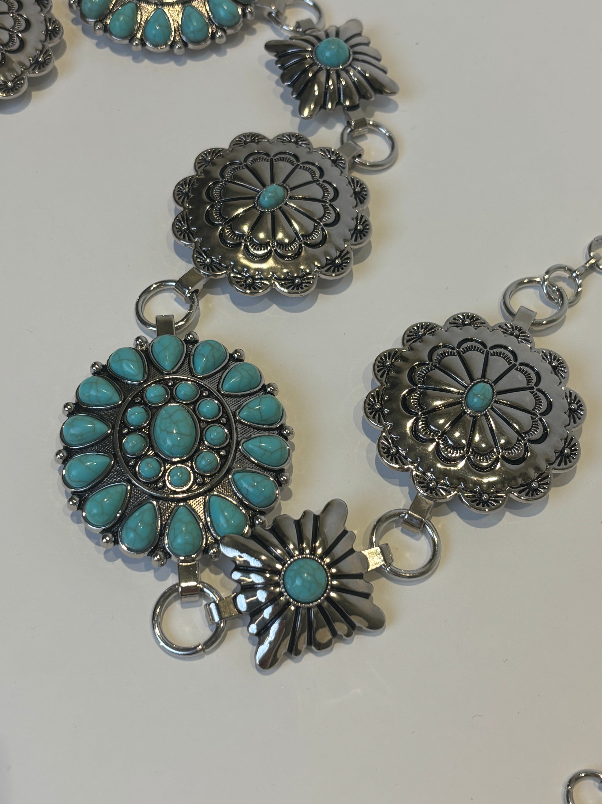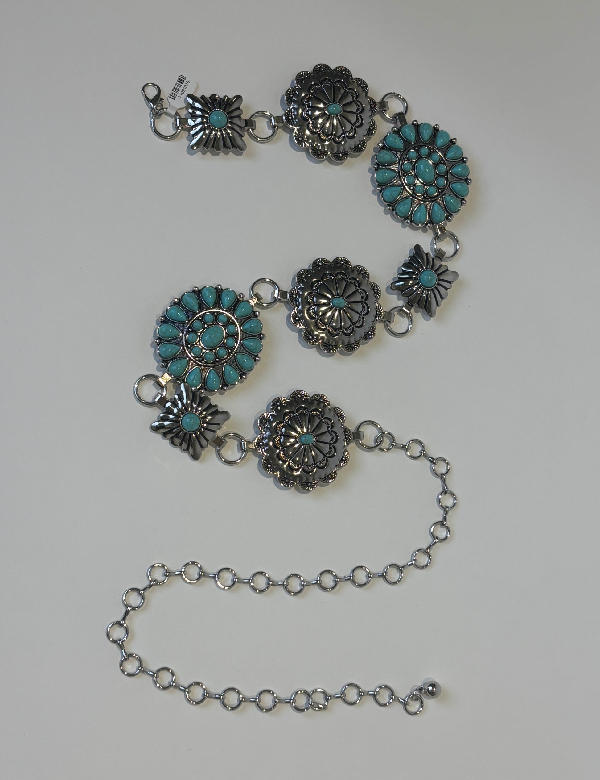 Add a bold western accent to your look with this Silver Chain Belt featuring eye-catching turquoise floral stones. Whether you're cinching it over a flowy dress or threading it through your favorite denim, this adjustable belt brings a fresh pop of color and timeless southwestern style.