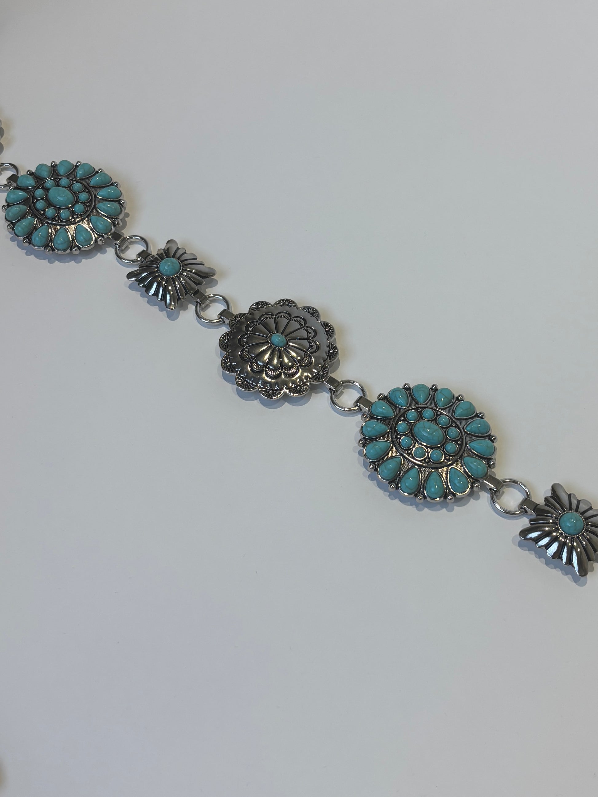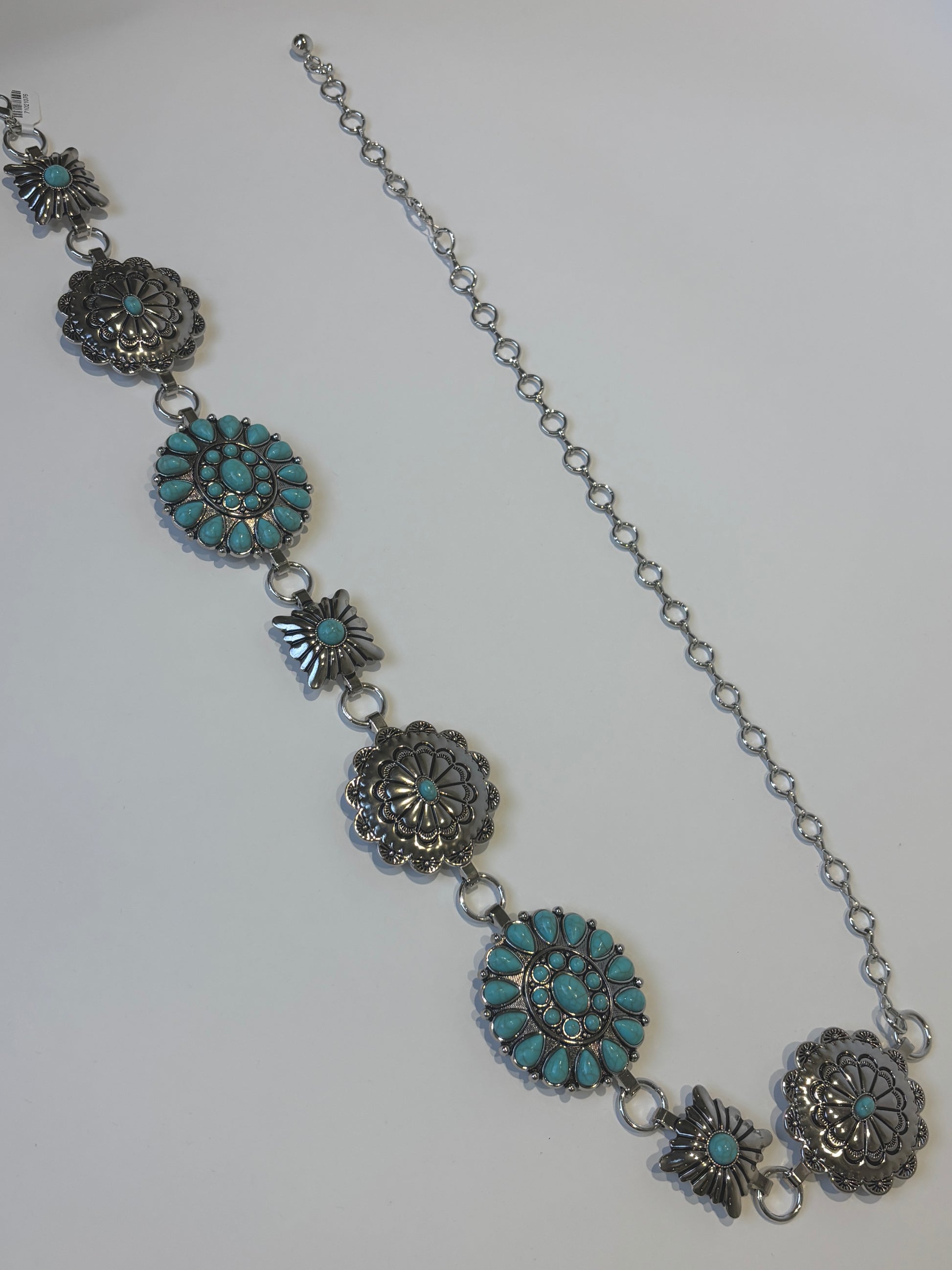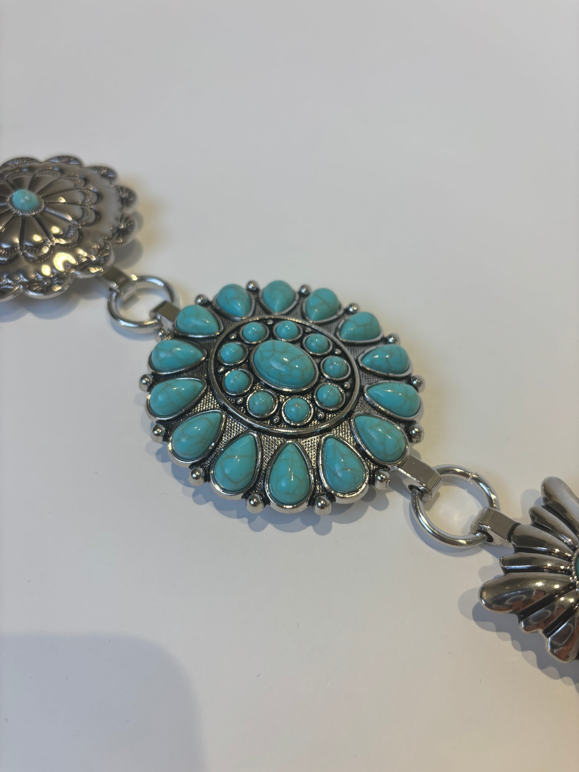 Add a bold western accent to your look with this Silver Chain Belt featuring eye-catching turquoise floral stones. Whether you're cinching it over a flowy dress or threading it through your favorite denim, this adjustable belt brings a fresh pop of color and timeless southwestern style.
