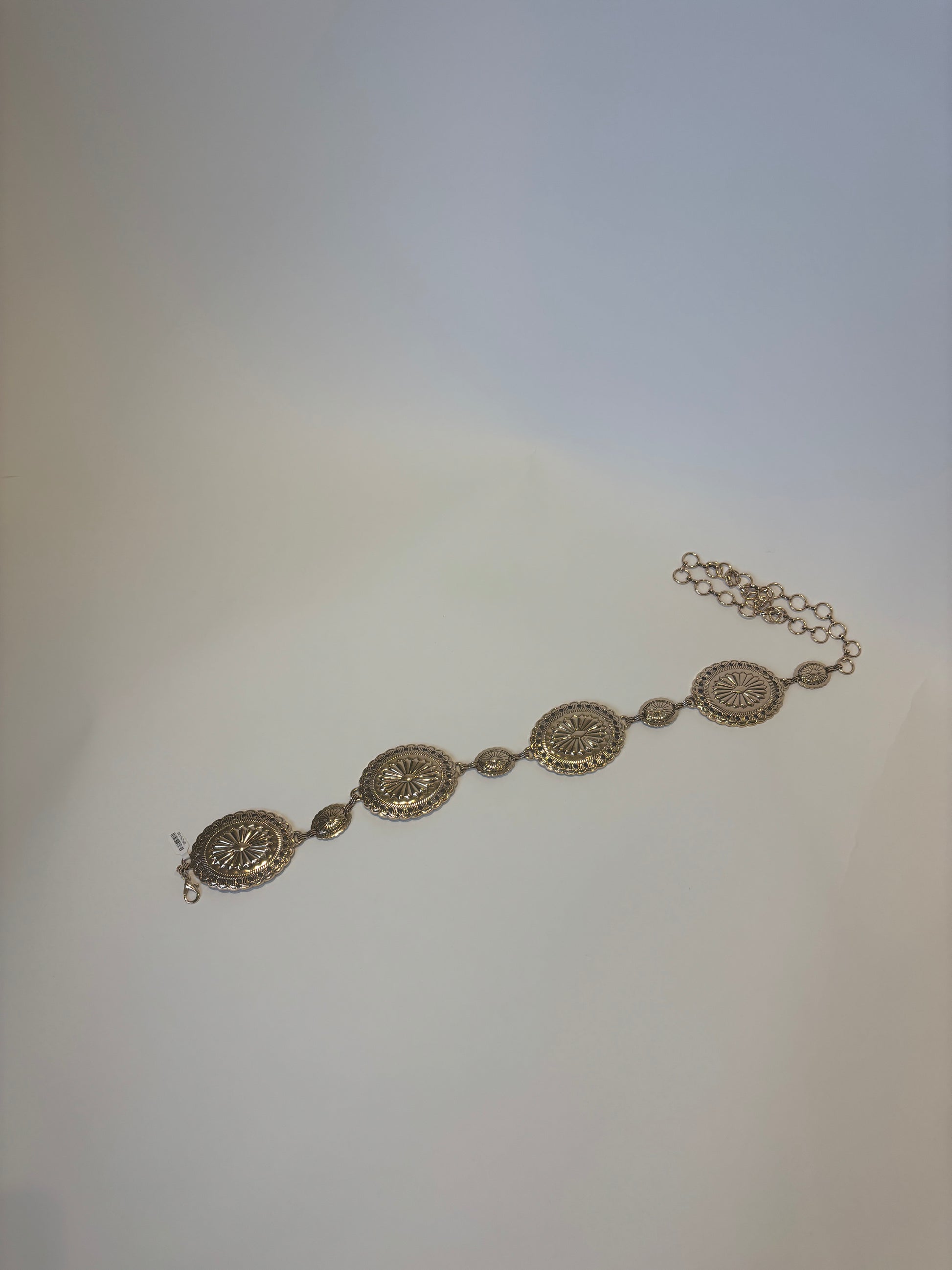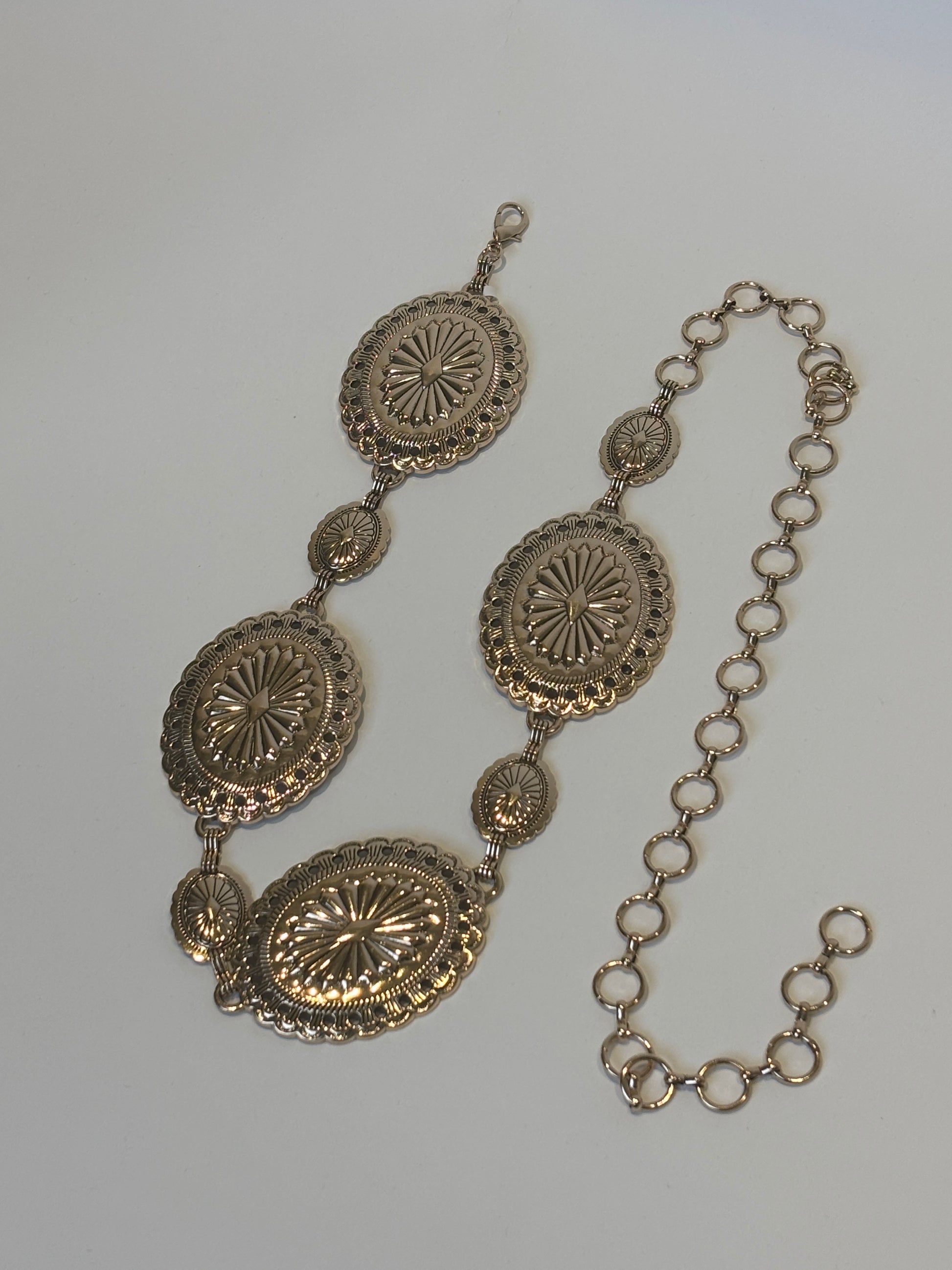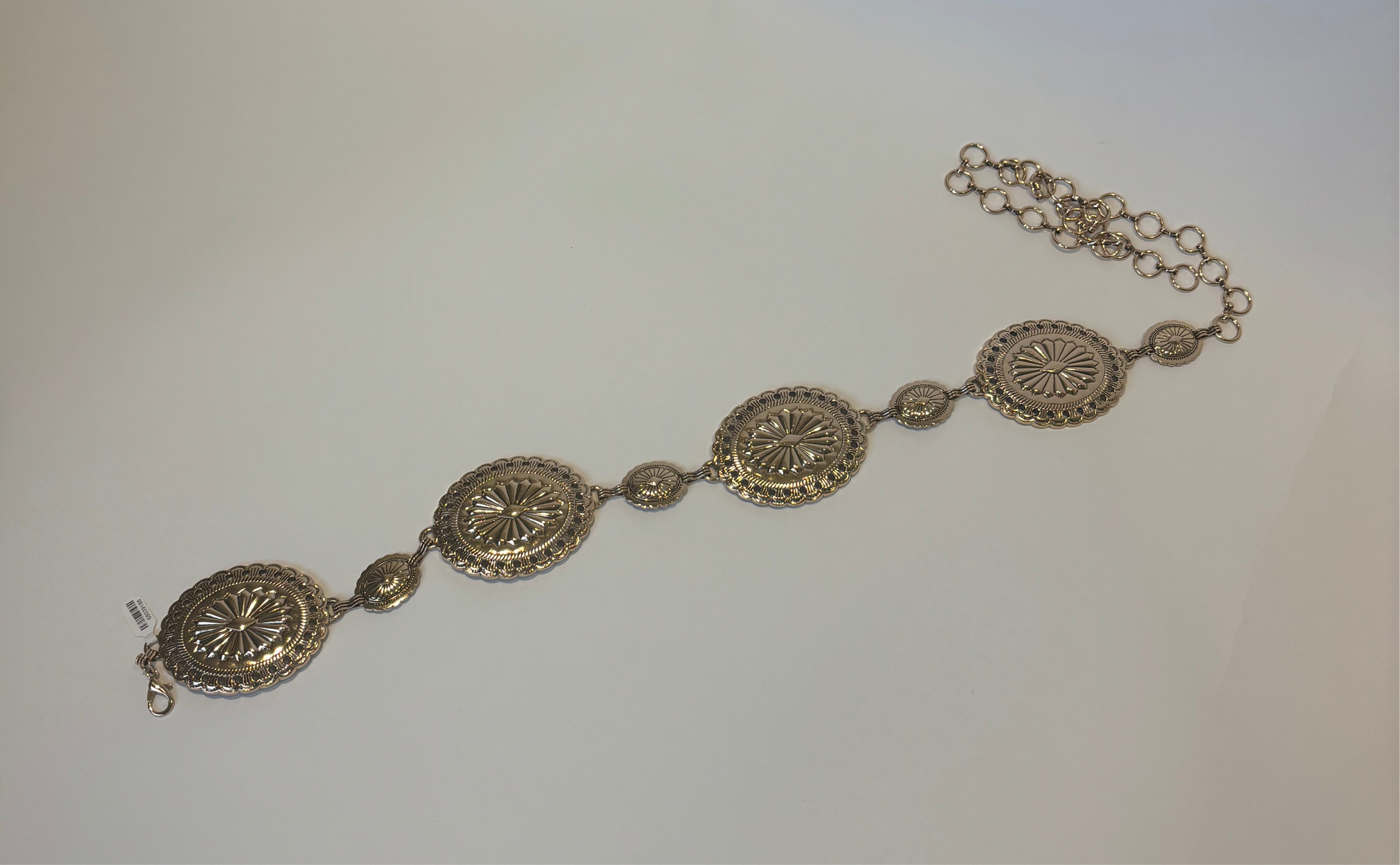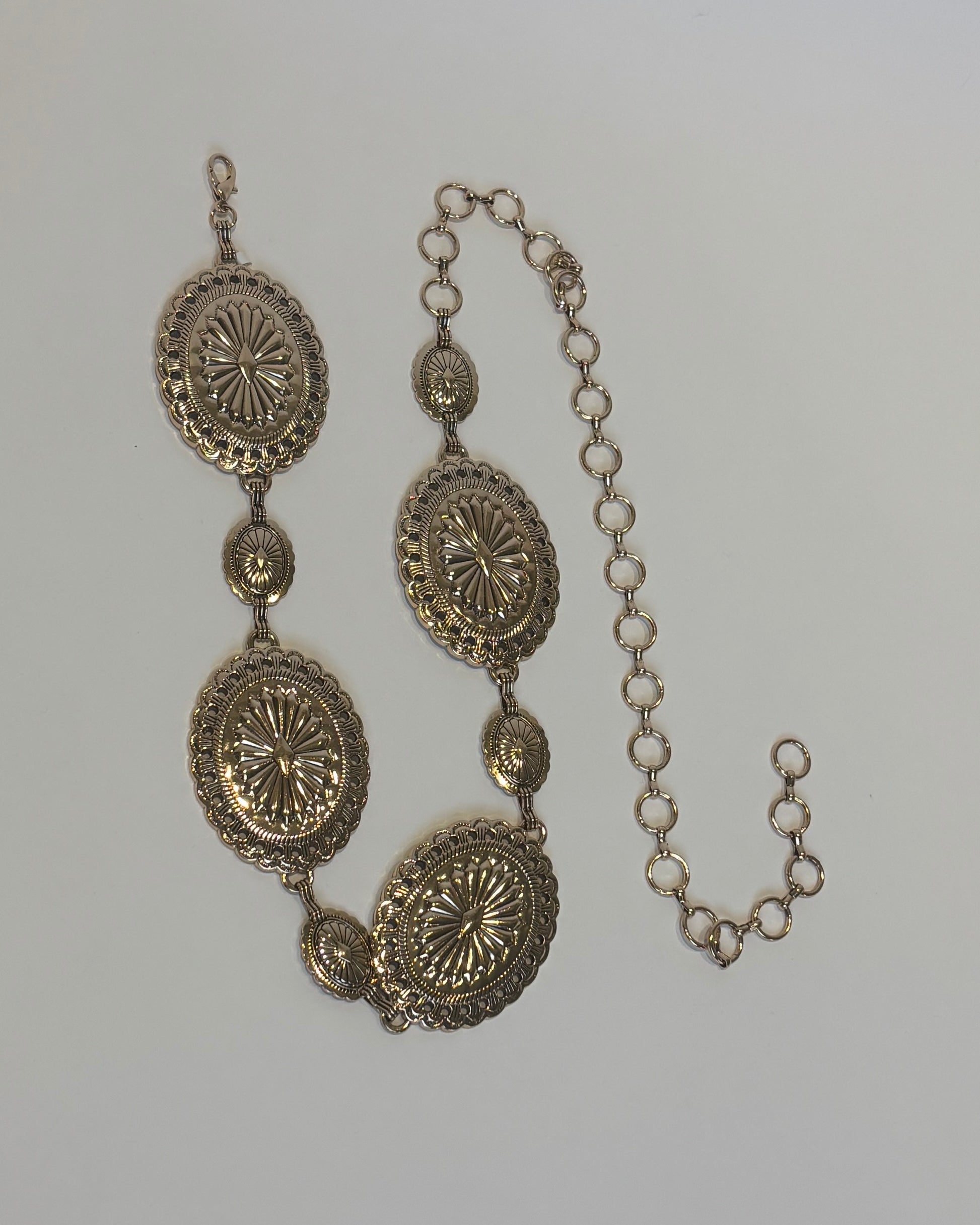 Turn heads with this bold and beautiful Western-inspired gold concho chain belt, perfect for adding a vintage edge to any outfit. Featuring intricately engraved oval conchos linked by an adjustable chain, this standout piece is equal parts rugged and refined.