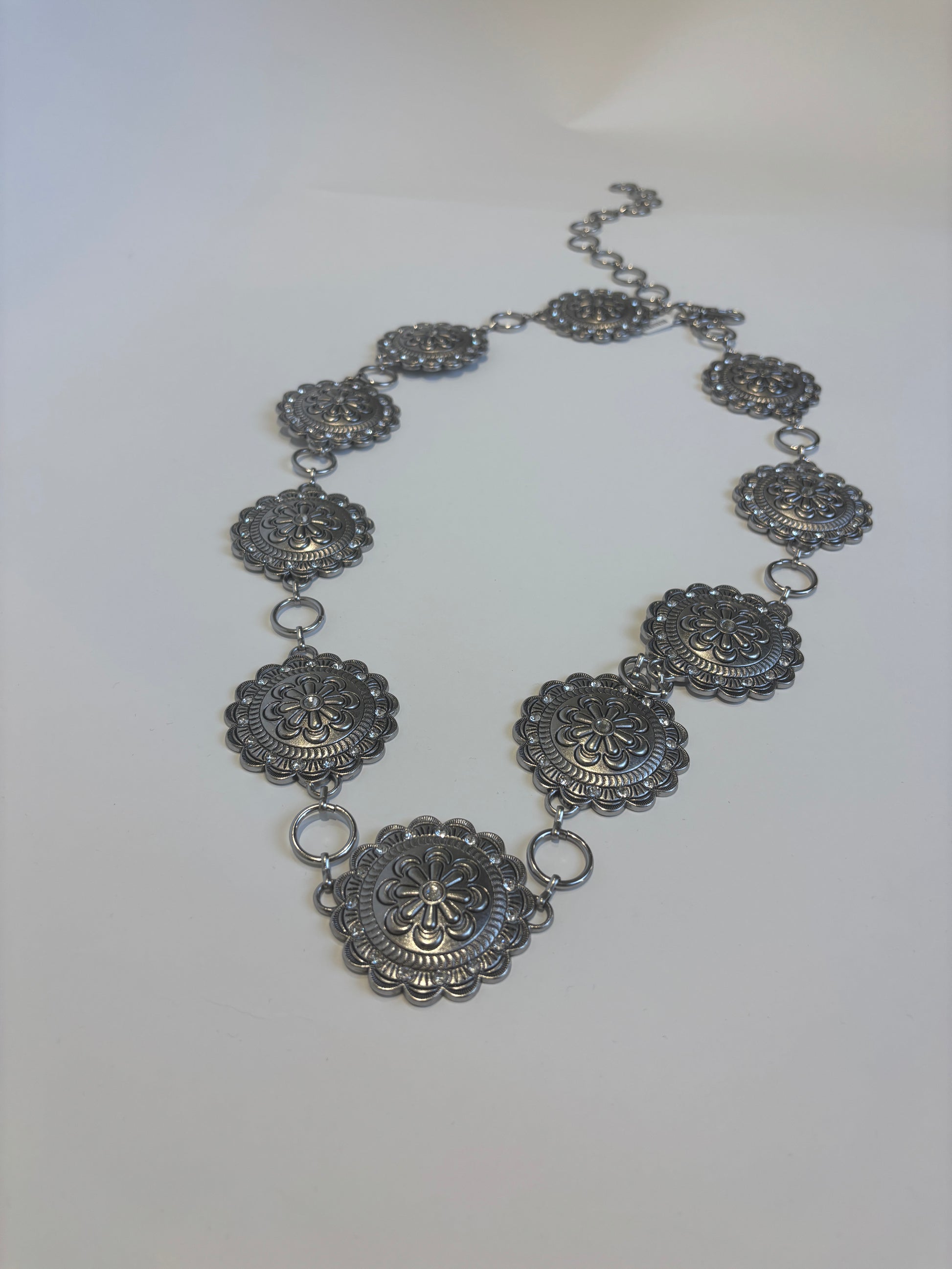 Turn heads with our Silver Chain Belt, a statement accessory designed to elevate any western-inspired look. Featuring delicate floral rhinestone details and a sleek silver-tone chain, this belt brings just the right touch of glamour and grit. Whether you're styling it over a dress, denim skirt, or classic high-rise jeans, this piece instantly adds shine and femininity to your outfit.
