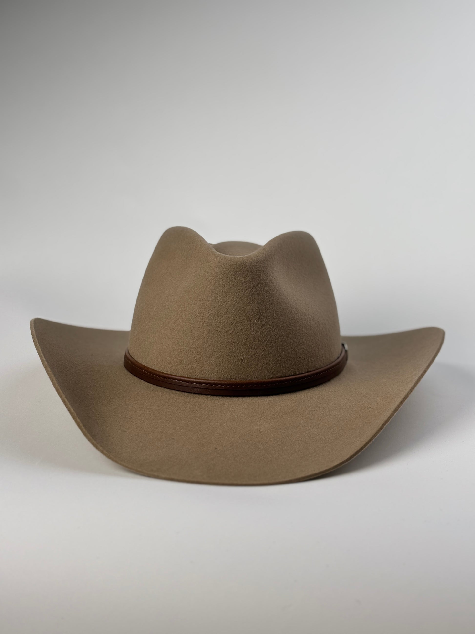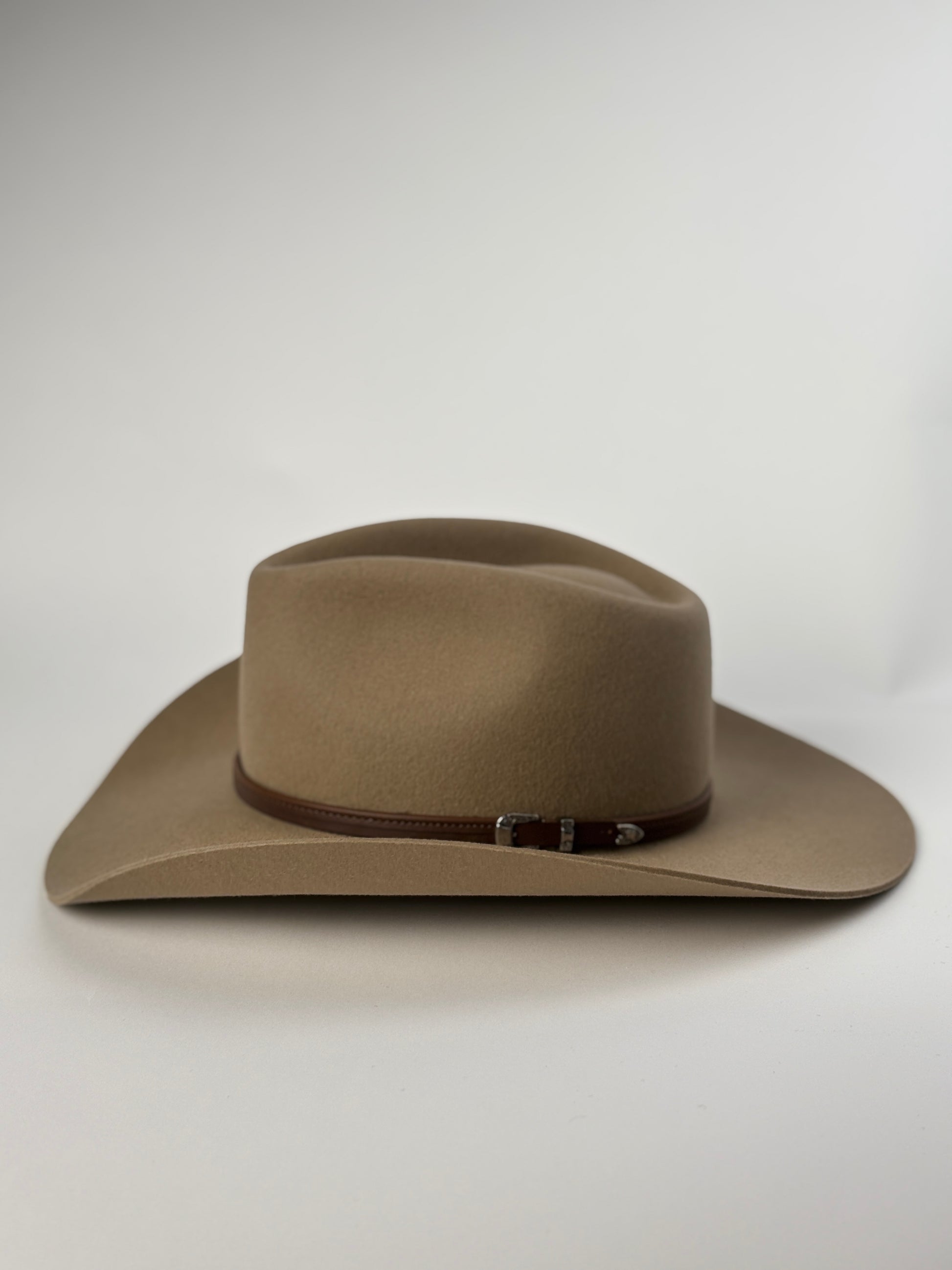 The Stetson Seneca 4X represents premium craftsmanship in western headwear. Handmade in Garland, Texas, this hat combines 4X quality buffalo fur felt with time-honored construction techniques. The oval pinch front crown delivers classic western styling, while the chocolate leather hatband and silver 3-piece buckle set add refined detail. A leather sweatband and satin liner ensure comfort during extended wear, and the water-repellent felt stands up to demanding ranch conditions. With a 3½" brim and 4¼" crown, the Seneca balances proportion and presence—a versatile choice for serious riders and collectors alike.