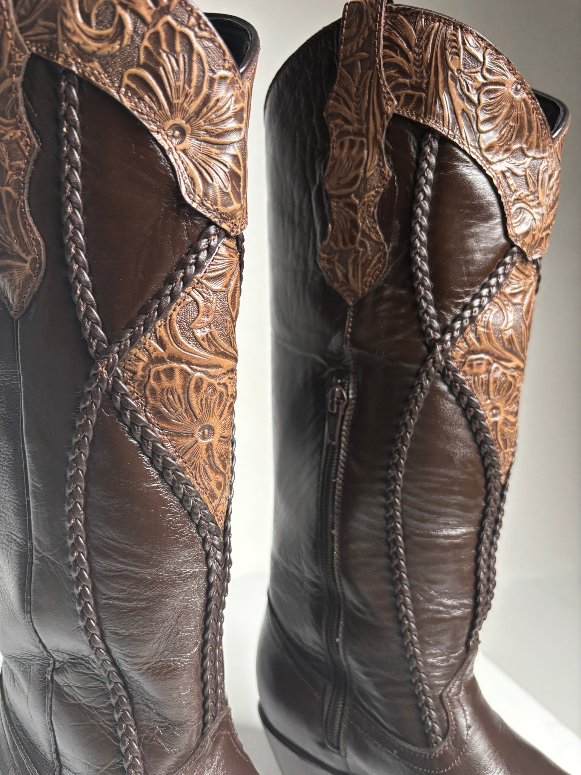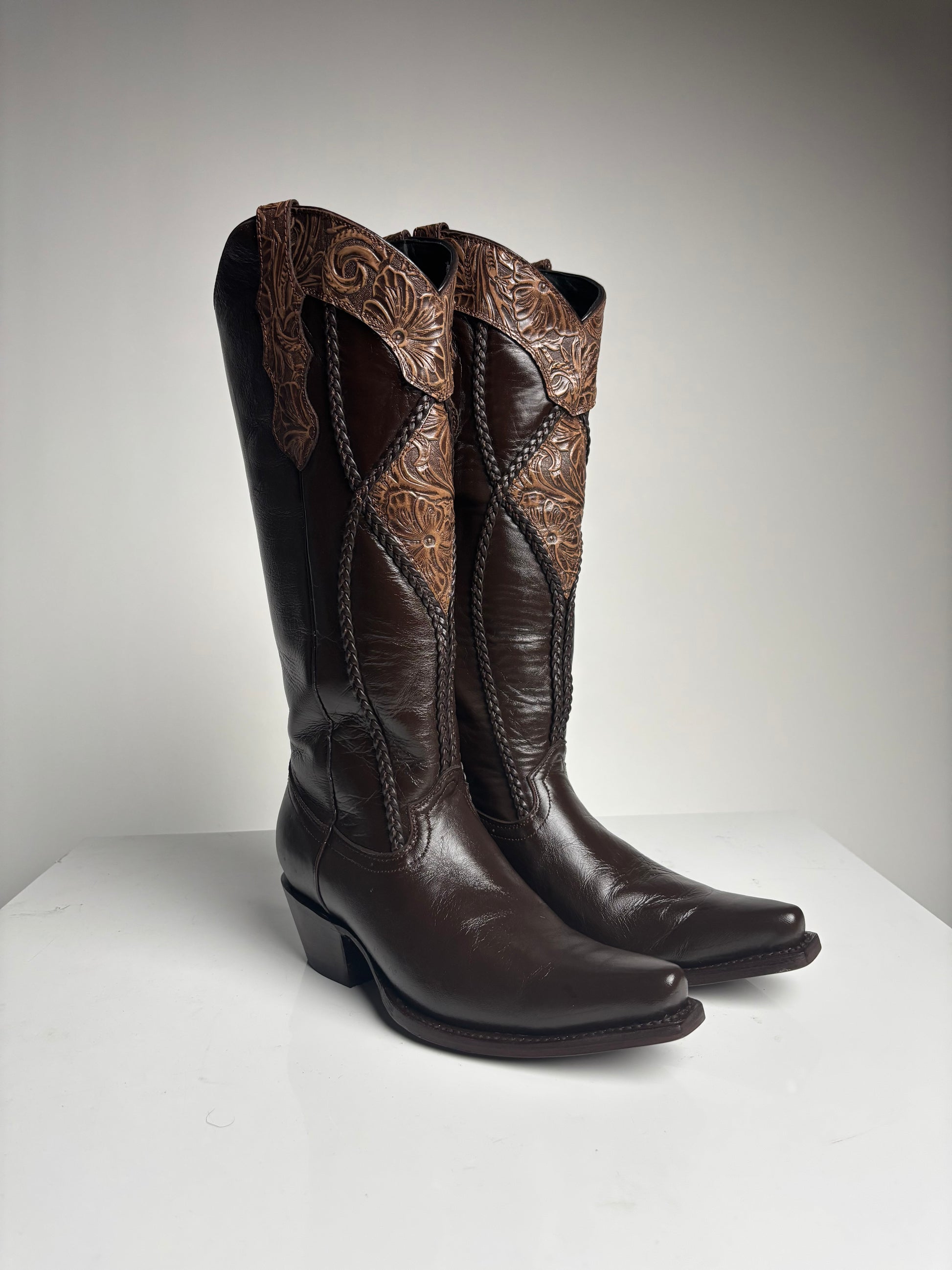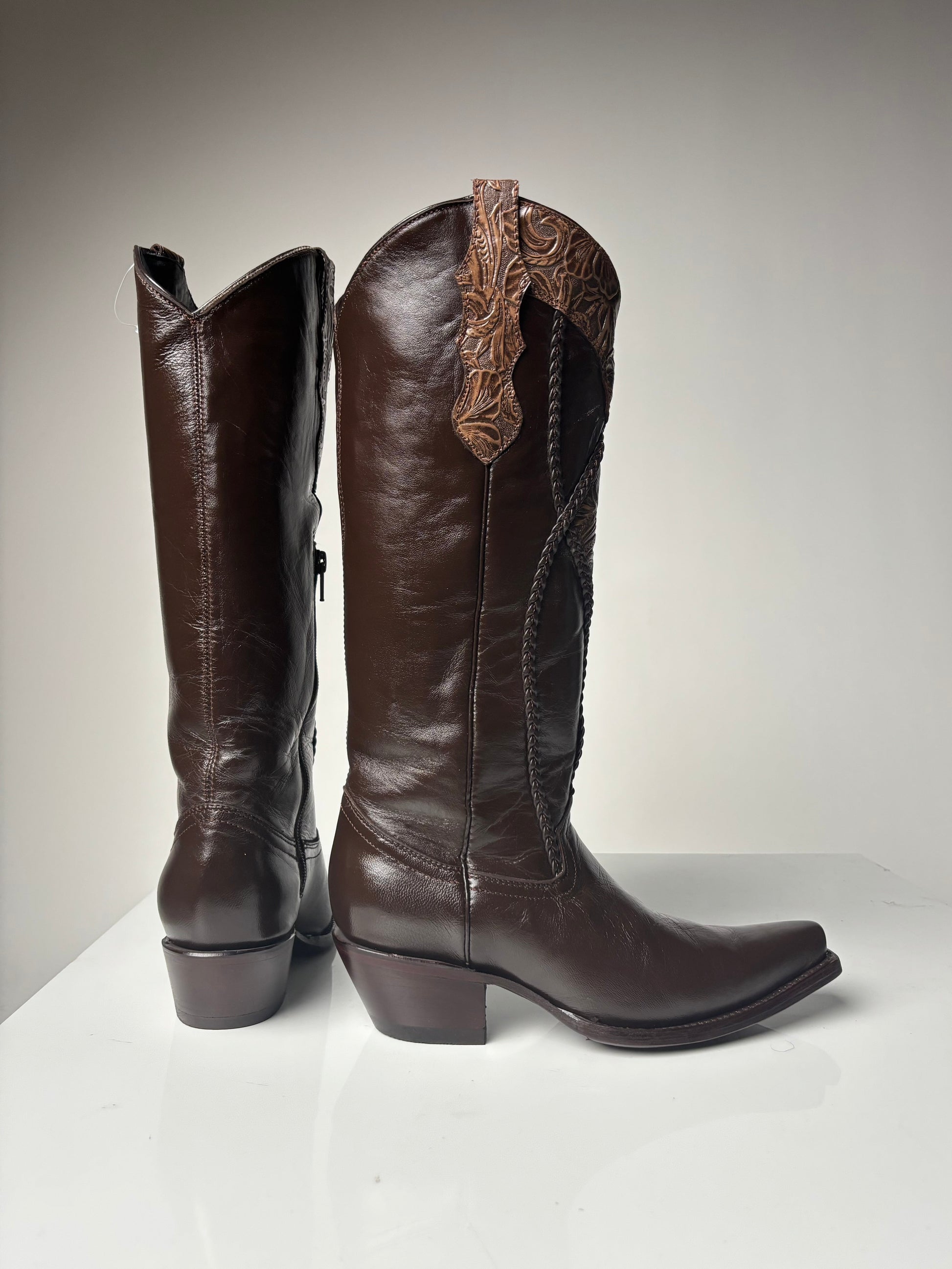 The Women's Brown Tall boot - White Diamond is the perfect combination of style and durability, expertly crafted with 100% leather. Its tall, snip toe design adds a touch of Western flair, making it a versatile and timeless addition to any wardrobe. With a convenient side zipper, these luxurious boots keep your feet comfortable and your fashion on point.