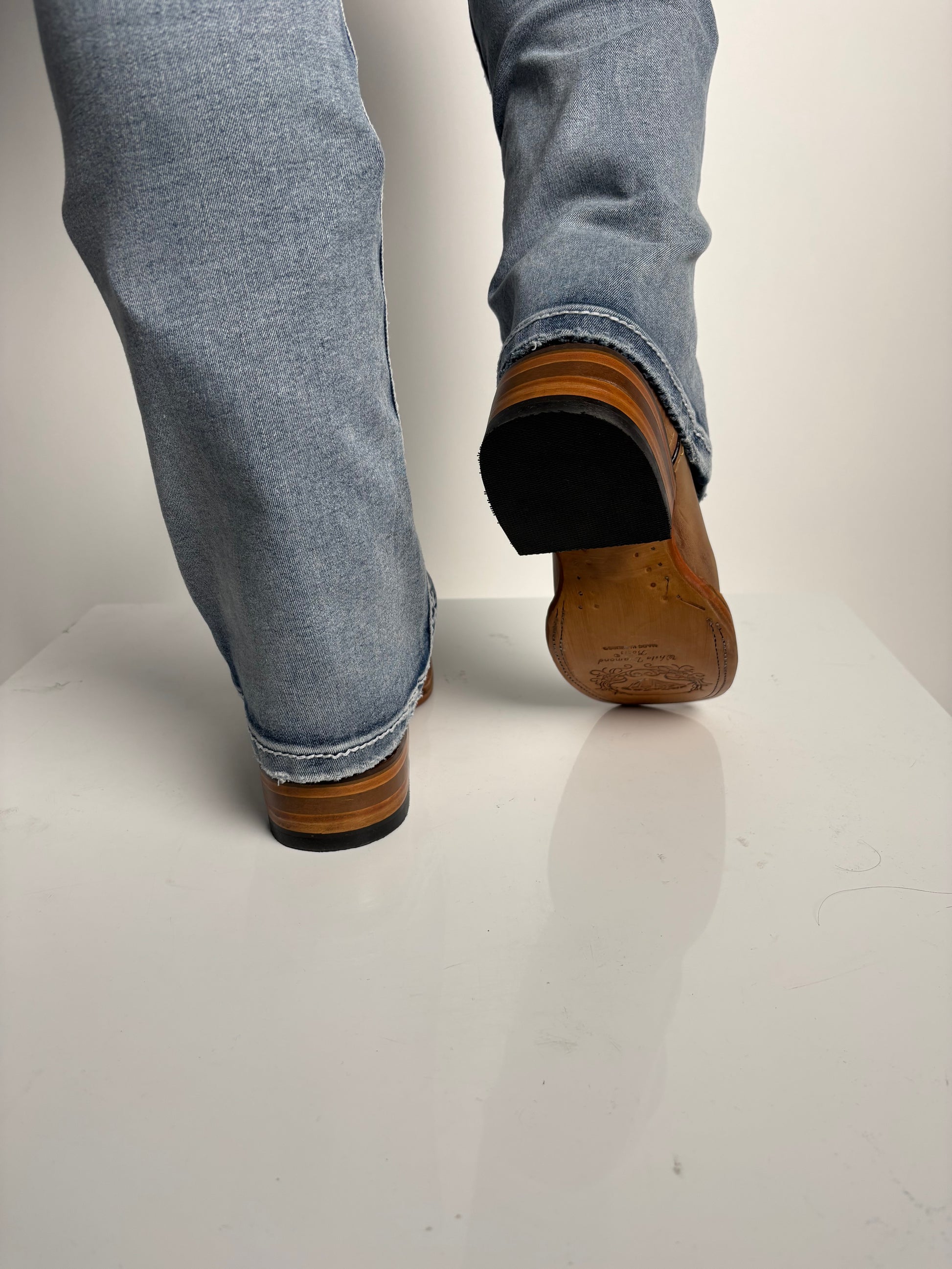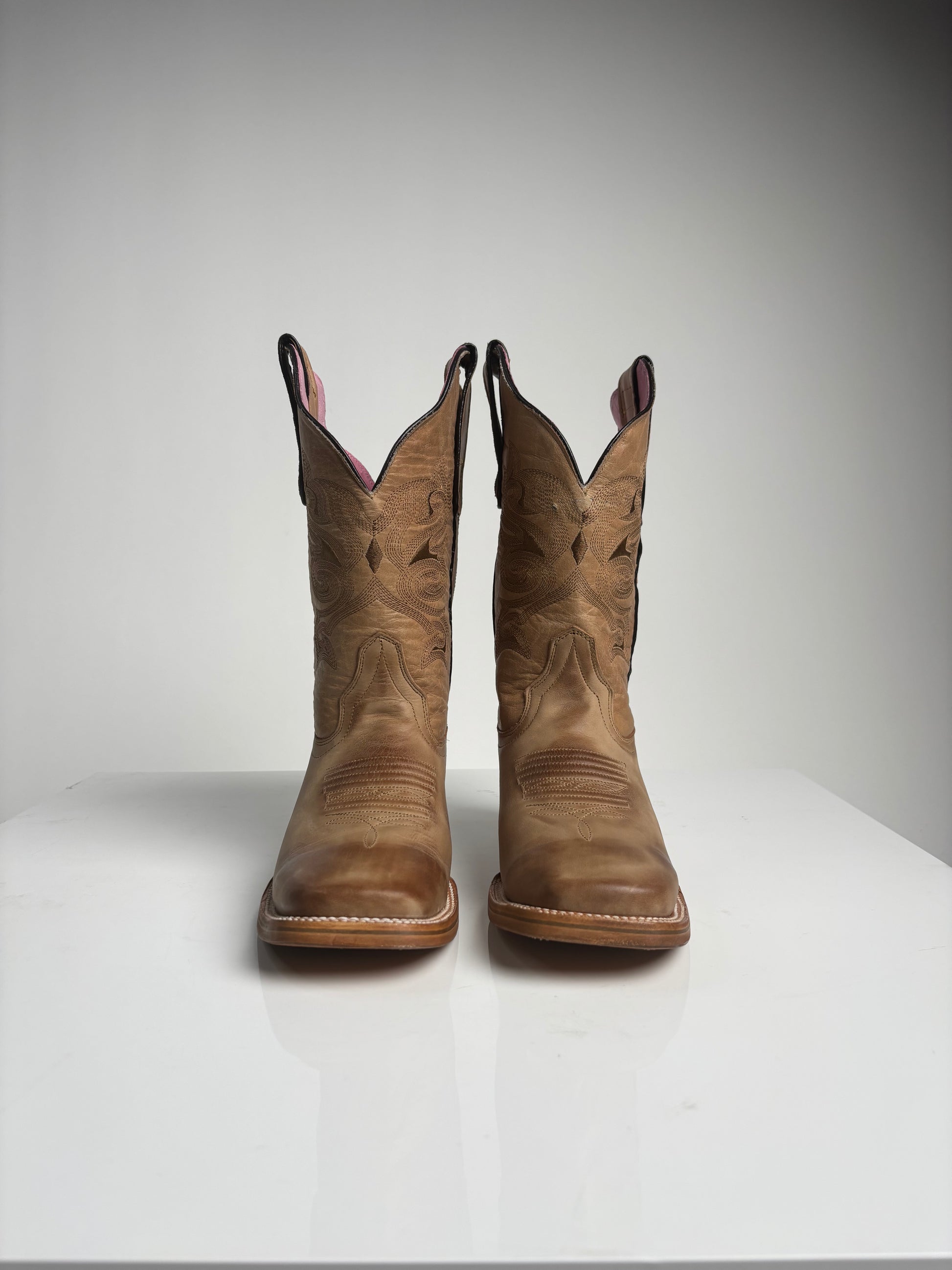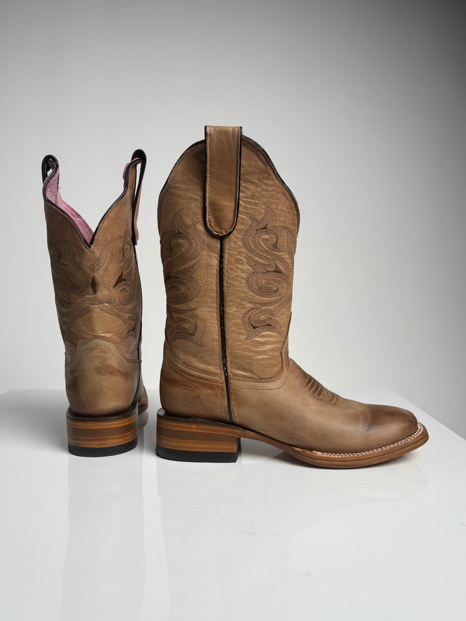 Experience the authentic cowboy life with our Women's Sand Western Rodeo Boot. Made of 100% leather, this boot is both stylish and comfortable. Featuring a western finish and pink interior, it's perfect for any cowgirl. Designed to run true to size with a wide calf access and pull straps for easy wear.
